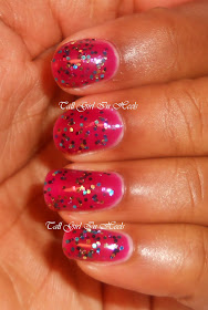Next you will add one coat of Paloma on top. This manicure has depth, the glitter seem to look suspended in the polish as if it were one polish. I really like the look of this. The below picture shows the comparison of leaving the glitter on top and the sandwich.